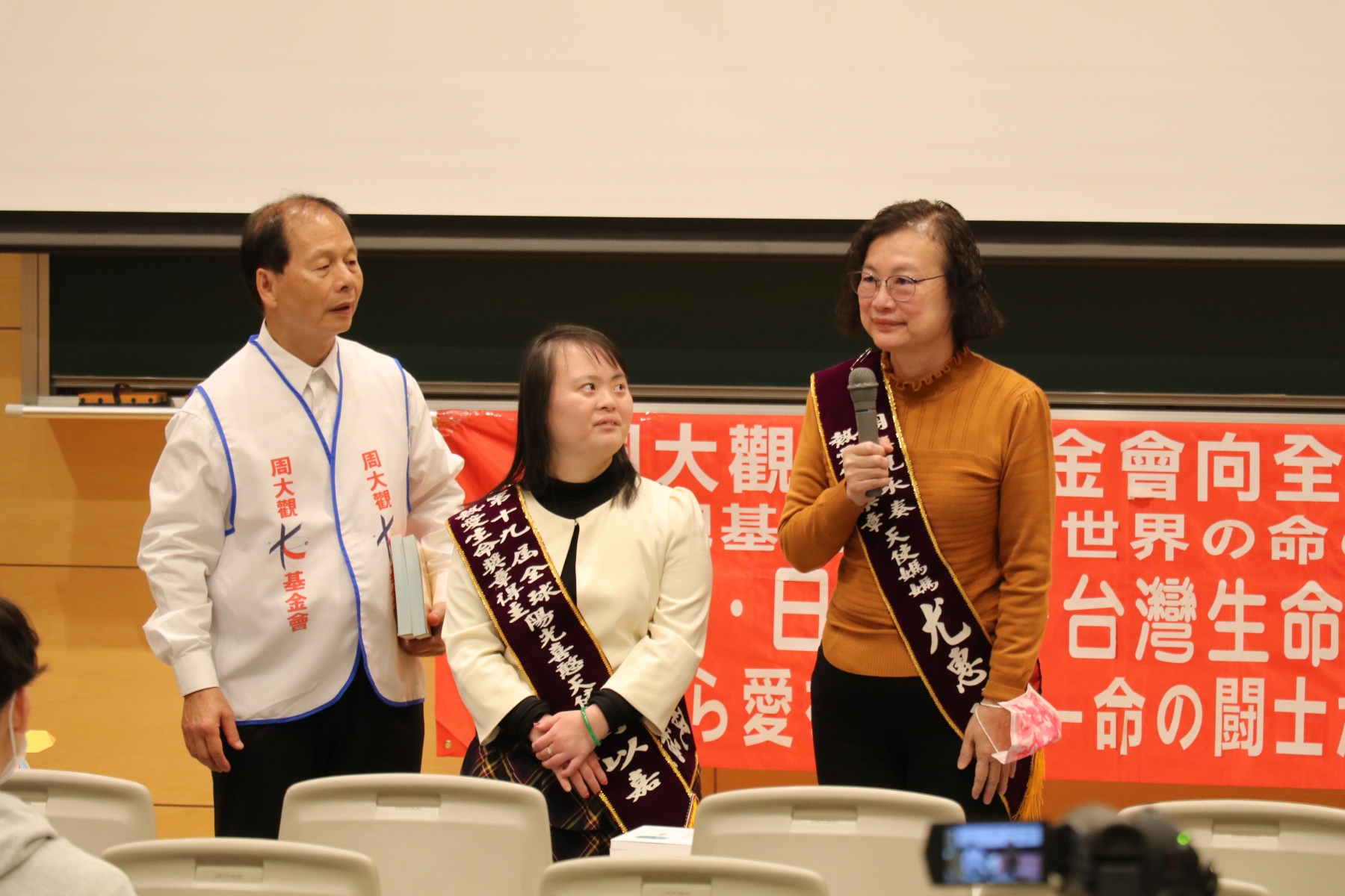 周大觀文教基金會創辦人周進華一行9人送愛北海道文教大學義演、生命分享交流,並捐贈周大觀遺作《我還有一隻腳》日文版、台灣小提燈等,由校長渡部俊宏代表接受,呼籲在座學生「少滑手機.讀出希望」。